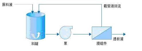 在过滤过程中料液通过泵的加压,料液以一定流速沿着滤膜的表面流过,大于膜截留分子量的物质分子不透过膜流回料罐,小于膜截留分子量的物质或分子透过膜,形成透析液。故膜系统都有两个出口,一是回流液(浓缩液)出口,另一是透析液出口。在单位时间(Hr)单位膜面积(m2)透析液流出的量(L)称为膜通量(LMH),即过滤速度。影响膜通量的因素有:温度、压力、固含量(TDS)、离子浓度、黏度等。